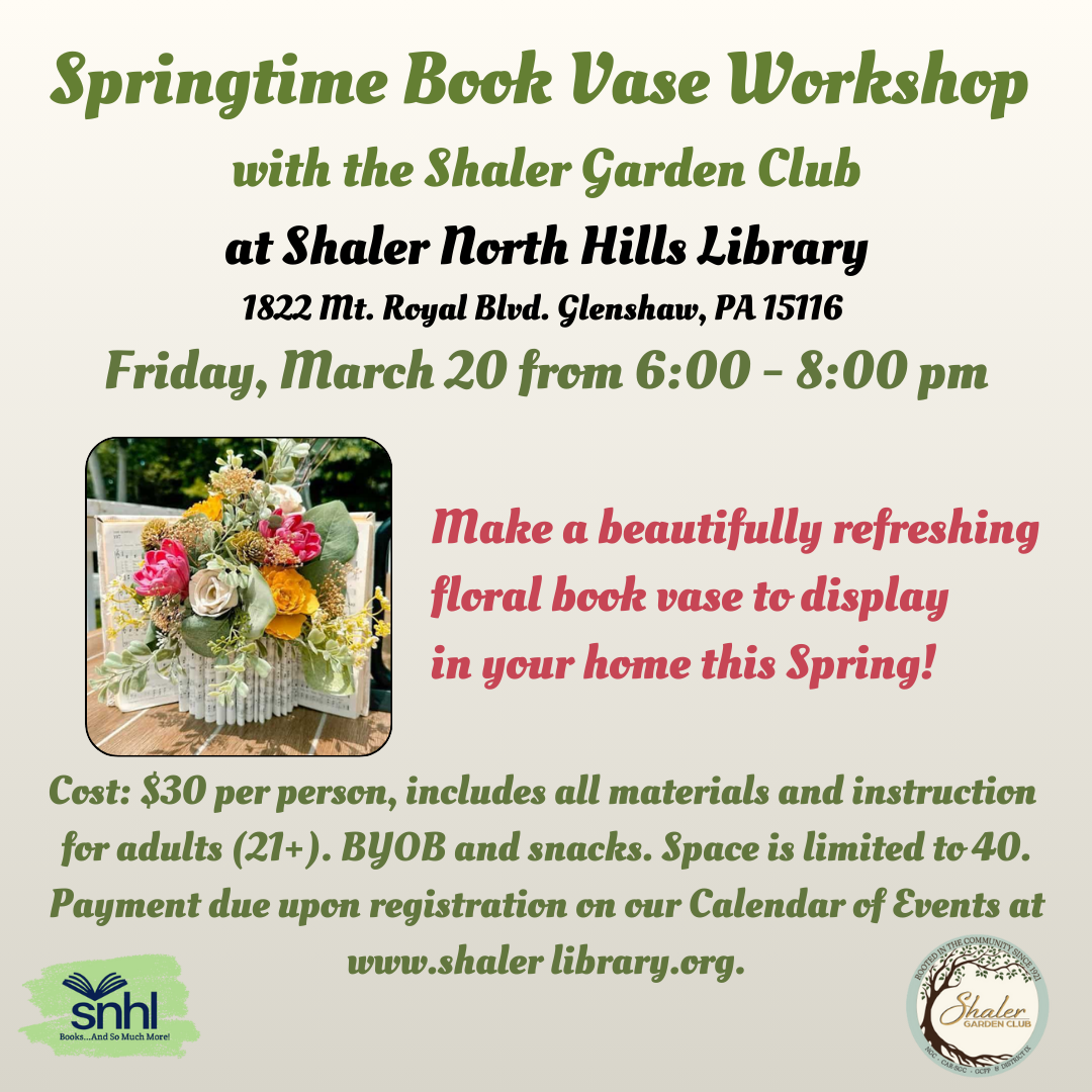 Join us for a special FUNdraiser with the Shaler Garden Club for this fun night out with family or friends to make a beautiful refreshing floral book vase to display in your home this Spring.
