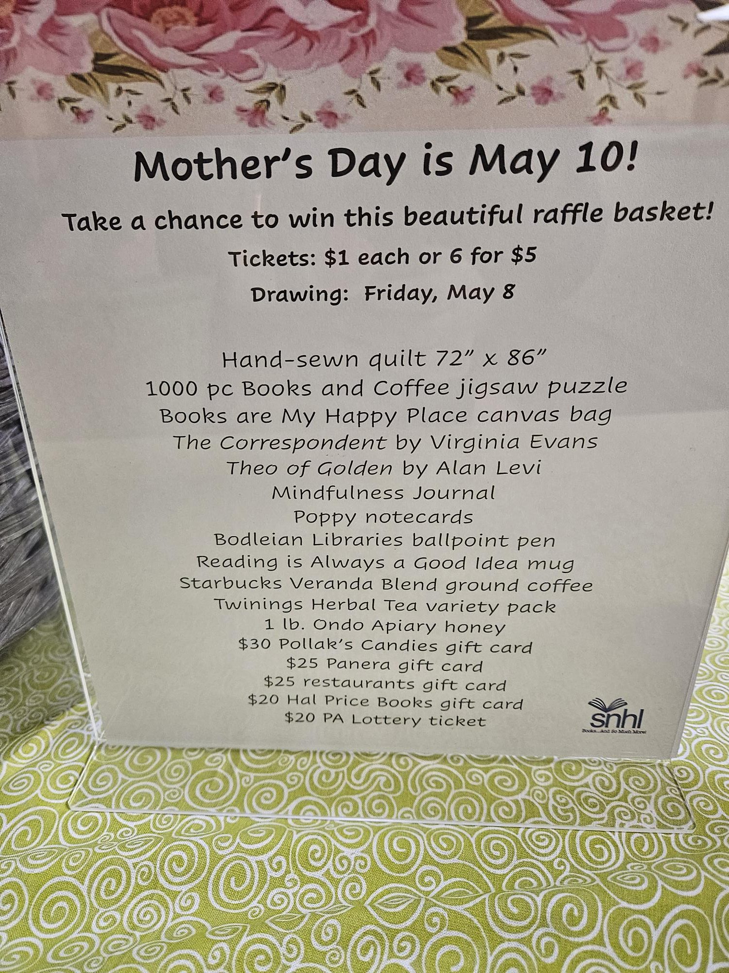 The Friends of the SNHL is pleased to offer this very special Mother’s Day Raffle. The basket is full of items that will make for a relaxing day for that special lady in your life. It includes a gorgeous, new handmade quilt donated by Kathy Dougherty. Tickets are $1 each or (6) for $5. Purchase online using the link below or at the library! Drawing will be held on May 8. Thank you for your support.